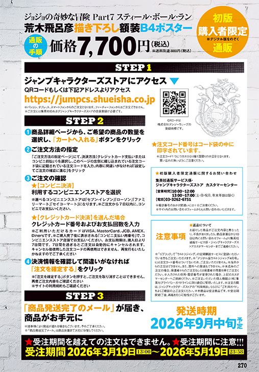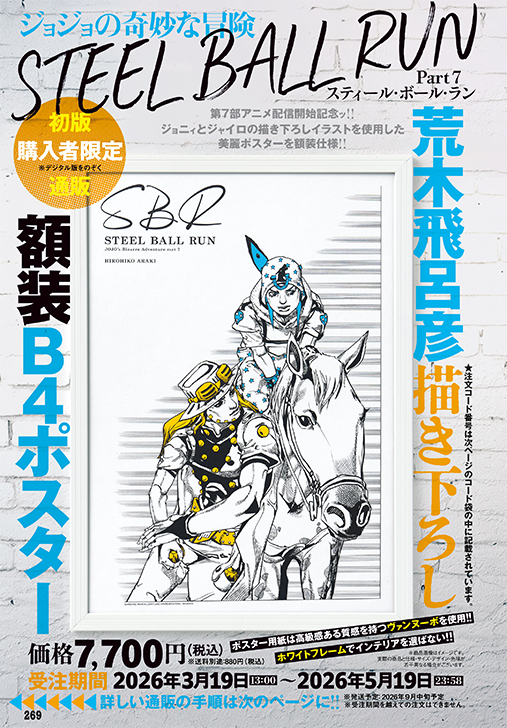 ★ 最 新 号 ★ 第7部アニメ3・19配信開始記念ッ‼ 額装仕様の描き下ろしポスターを誌上通販! 2026年3月19日(木) 初版購入者限定通販 「荒木飛呂彦描き下ろし『ジョジョの奇妙な冒険 Part7 スティール・ボール・ラン』額装B4ポスター シェアする ツイート シェア